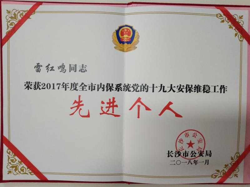 付出总有收获,在十九大维稳工作期间,黄花国际机场没有发生一起重大公共安全案件,确保了党的十九大期间的安全与稳定。并被长沙市公安局评定为全市内保系统党的十九大安保维稳工作先进集体称号,公司董事长雷总被评定为全市内保系统党的十九大安保维稳工作先进个人称号。
